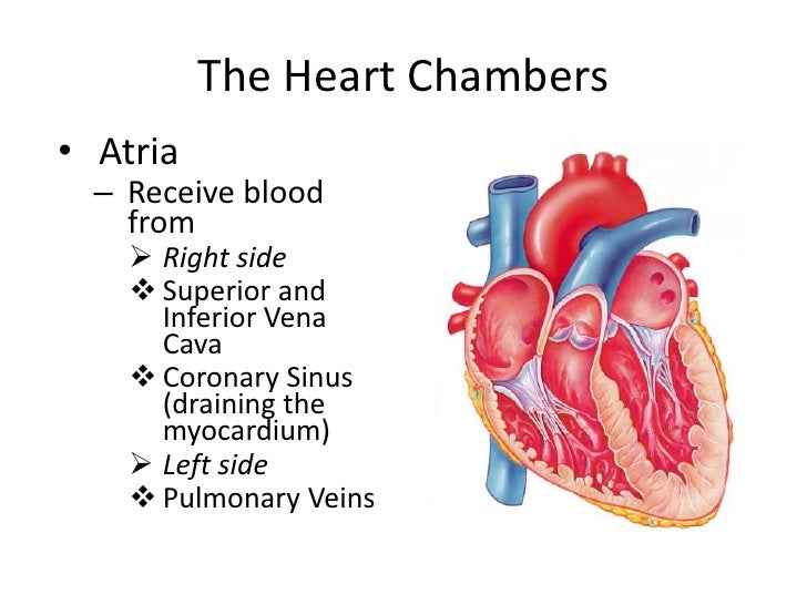 The Receiving Chambers Of The Heart. Blood flows into the right atrium from the vena cava. The lower chambers, the more muscular right and left ventricles, pump blood out of the heart.