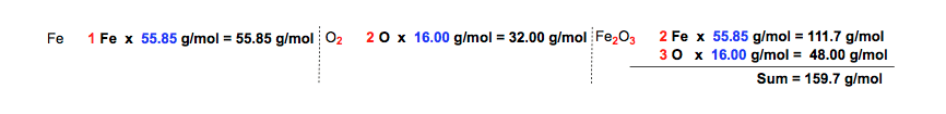 The molar mass of fe2o3 is 55.845 (molar mass of iron)*2+16(molar mass of oxygen)*3, which comes out. So, the iron is 111.69 / 159.69 = 0.6994 times the mass of fe2o3. 6 rows molecular weight/ molar mass: