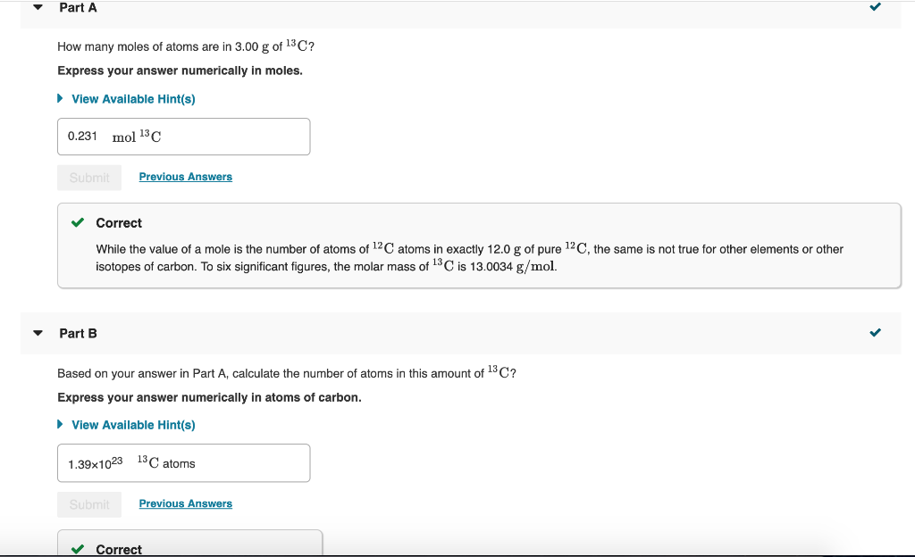 How Many Moles Of Atoms Are In 8 00 G Of 13C. Answer is 0.692 mol 13c based on your answer in part a, calculate the number of atoms in this amount of 13c? Part a 13 how many moles of atoms are in 6.00 g of c?