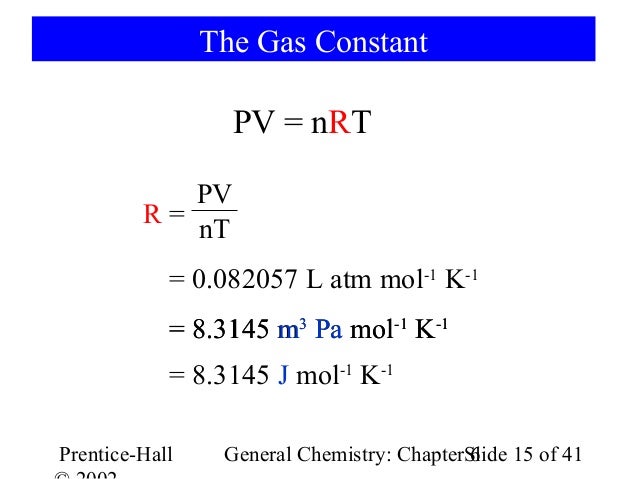 A pv = nrt problem what is the volume of 1 mole of an ideal gas at stp (standard temperature and pressure = 0 °c, 1 atm)? This gas constant referred to as a physical constant that is introduced in different fundamental equations in the physical sciences, such as the ideal gas law, the arrhenius equation, and the nernst equation. This implies thatfor air, you should use the worth r = 287 j/kg.